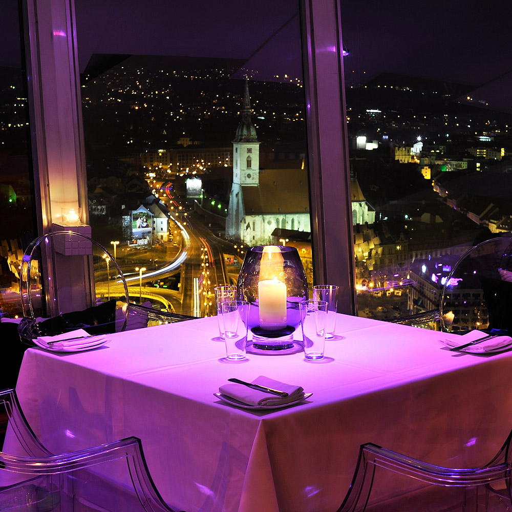 Das Restaurant UFO watch.taste.groove in Bratislava ist eine einzigartige Dining-Destination auf dem UFO Tower an der Most SNP (Brücke des Slowakischen Nationalaufstands). Mit einem Panoramablick auf die Stadt und die Donau aus 95 Metern Höhe vereint es moderne europäische Küche mit einer unvergesslichen Atmosphäre.