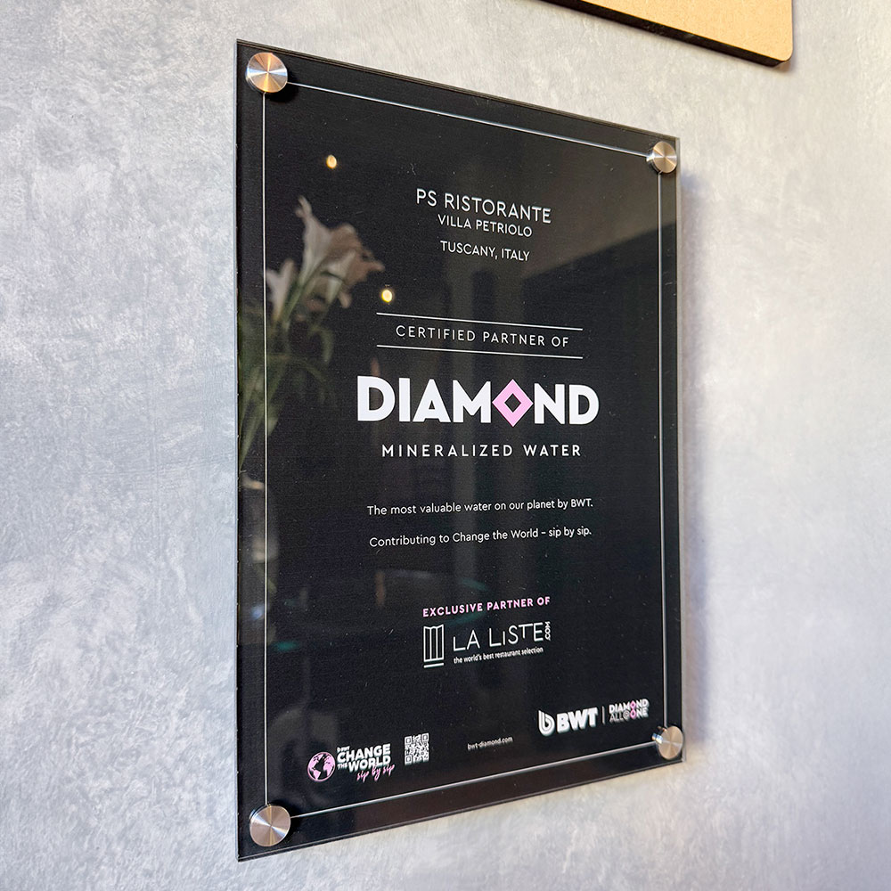 Um die Initiative von María und Héctor einen Schritt weiterzuführen, bietet Villa Petriolo nun Diamond Mineralized Water an. Dieses exklusive toskanische Wasser wird lokal gefiltert und mineralisiert, stets frisch zubereitet und direkt im Restaurant abgefüllt. Dadurch wird der Bedarf an Flaschenwasser überflüssig, was die CO₂-Emissionen durch Transport erheblich reduziert. Der Mineralisierungsprozess ist patentiert von BWT und 100 % natürlich, ähnlich wie bei einem artesischen Brunnen, in dem Wasser über Gesteinsschichten fließt, gereinigt und mit wertvollen Mineralien angereichert wird. Auf diese Weise steigern Spurenelemente wie Magnesium und Silicat den Geschmack und fördern das allgemeine Wohlbefinden.